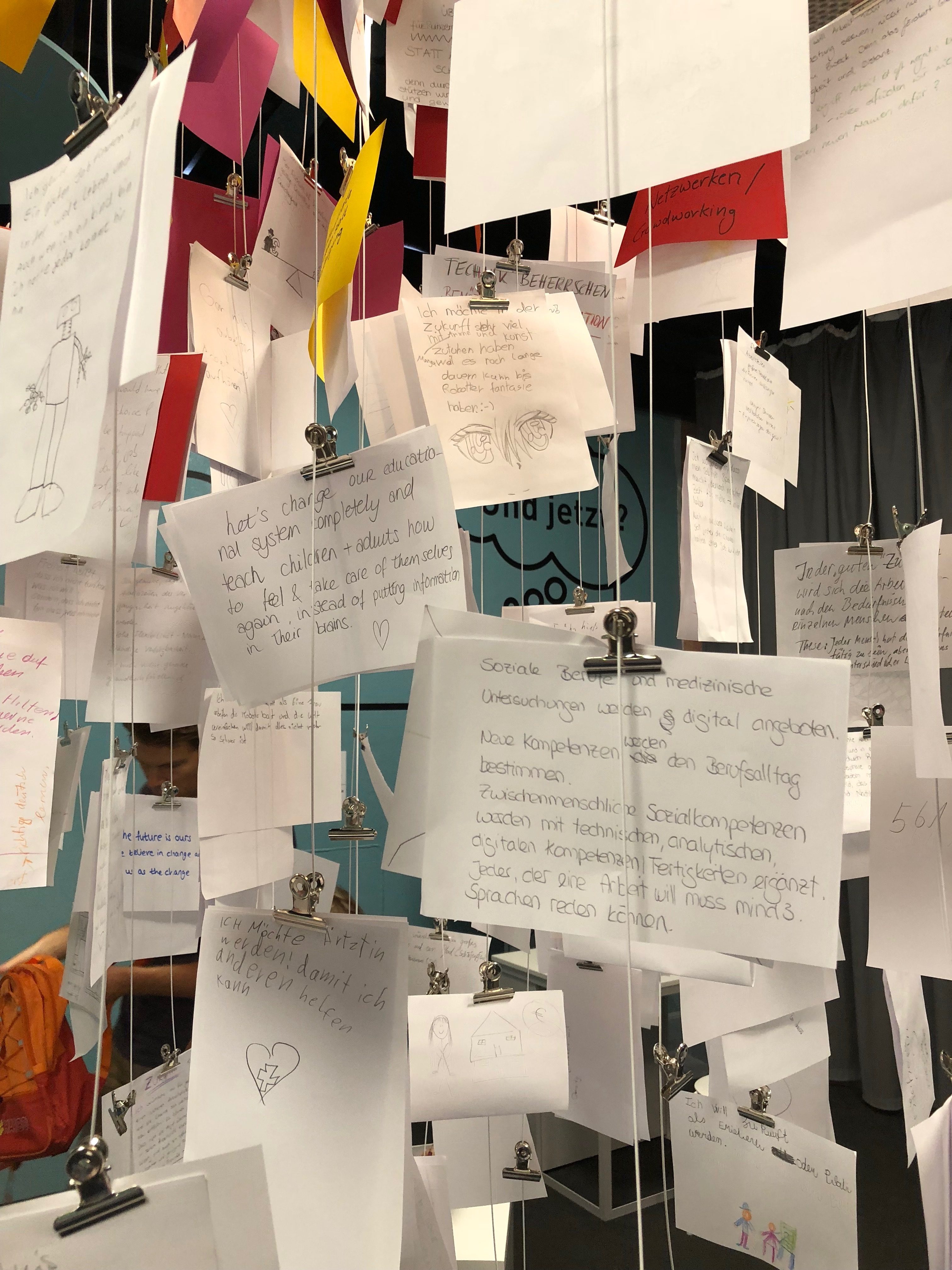 Im hinteren Bereich der Ausstellung wurde es dann noch einmal philosophisch. Hier wurden die Besucher eingeladen, ihre Wünsche und Gedanken zur Zukunft der Arbeitswelt zu Papier zu bringen und aufzuhängen. Neben den Berufswünschen der kleinen Besucher, die von ihrem Traumjob träumten oder von einer Welt mit viel Freizeit träumen, fanden sich auch kritische Stimmen und Gedanken, sowie gesellschaftliche Forderungen, damit in Zukunft die Arbeit zur Selbstverwirklichung eines jeden einzelnen Menschen beiträgt.